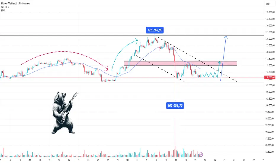 Il grafico a 4 ore mostra che BTCUSDT sta gradualmente completando un modello di accumulo a fondo piatto attorno alla forte area di supporto di 110.000, dopo un profondo calo dal picco di 126.210.