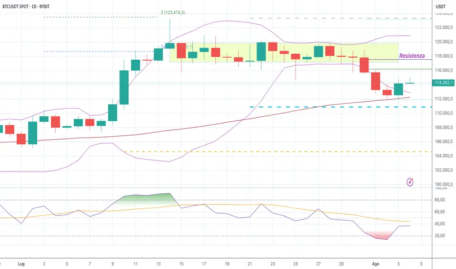 Sul grafico daily, si può vedere come il prezzo, dopo l'ATH del 14 luglio a 123.260$, abbia avviato una fase di congestione durata una quindicina di giorni, fino a un breakout ribassista avvenuto nella notte di giovedì. Sabato, il prezzo è sceso a un minimo di 112.700$ e ha testato la media mobile a 50 periodi, senza scendere al di sotto del livello di supporto principale di breve termine (dato dal vettore che va dal minimo di giugno al suo ATH), che passa in area 110.800$.