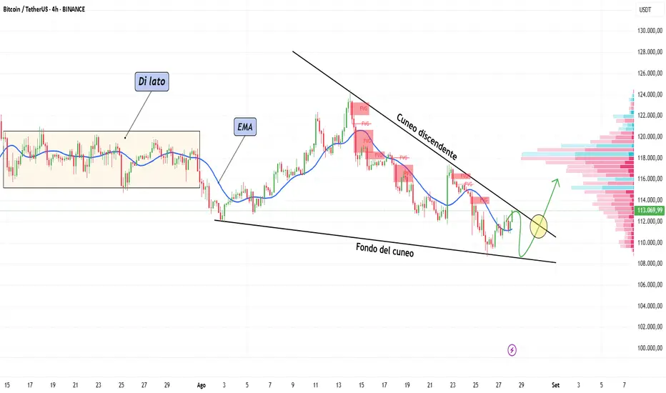Bitcoin è scambiato intorno a 112.840 USDT, muovendosi all'interno di un pattern a cuneo discendente sul grafico a 4 ore. Questo è solitamente un pattern di consolidamento prima di una rottura al rialzo.