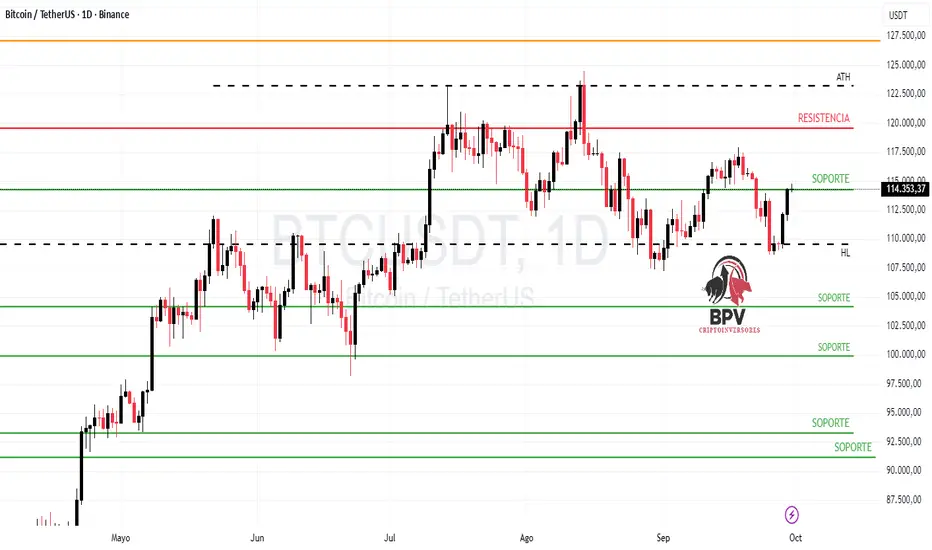 - En el gráfico diario, se observa que Bitcoin hizo un piso cercano a $108,700 USD en días recientes, y desde ese nivel ha mostrado recuperación hasta acercarse nuevamente a los $114,000 USD.
