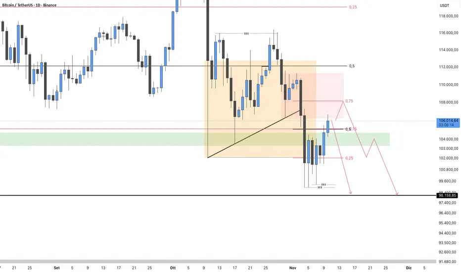 Si trova in un bel setup ribassista, essendo entrato in una supply zone e in due FVG ribassisti. Inoltre, il prezzo si trova in zone di FIBO interessanti. Da monitorare attentamente, perché ci sono forti probabilità di una discesa 📉💰