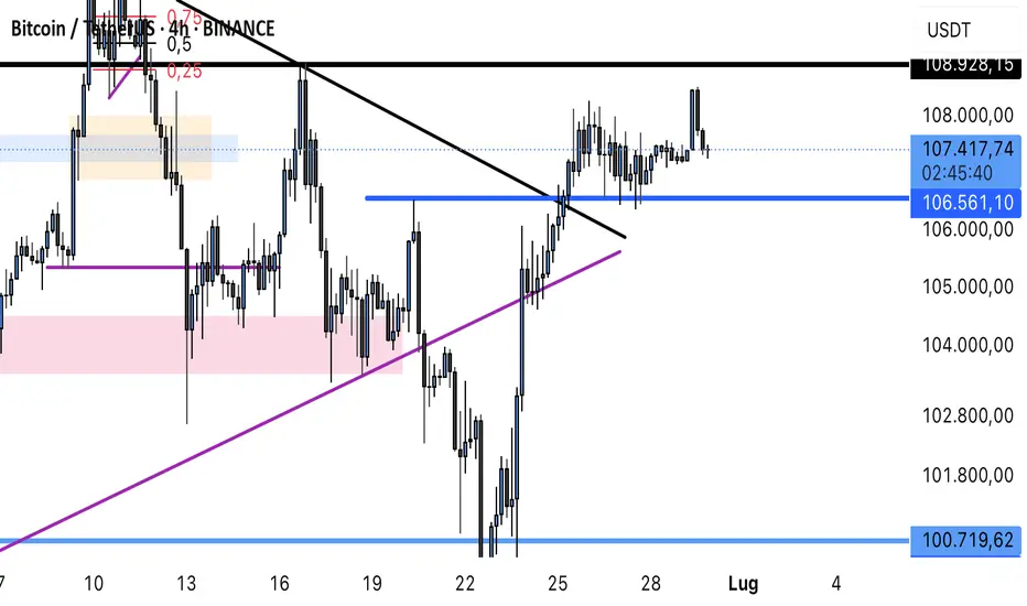 Il prezzo del BTC si trova ancora oggi in un range nella zona. Tuttavia, ha fatto un rapido sweep del massimo, il che potrebbe forse indicare l’intenzione di sweepare anche i minimi, per poi rimbalzare verso l’alto.