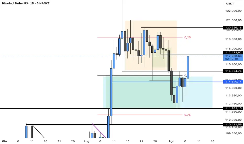 Il prezzo del BTC mostra durante la giornata la formazione di una candela rialzista ad alta volatilità, segnando probabilmente l’inizio di un aumento del prezzo. Inoltre, si nota che il rimbalzo parte con forza, il che tende a indicare che il mercato dovrebbe rimanere rialzista per il momento. Il prezzo non dovrebbe avere difficoltà a raggiungere la zona dei 120'000; in quella zona, se la resistenza viene rotta, allora non dovrebbe avere difficoltà a puntare l’ATH.