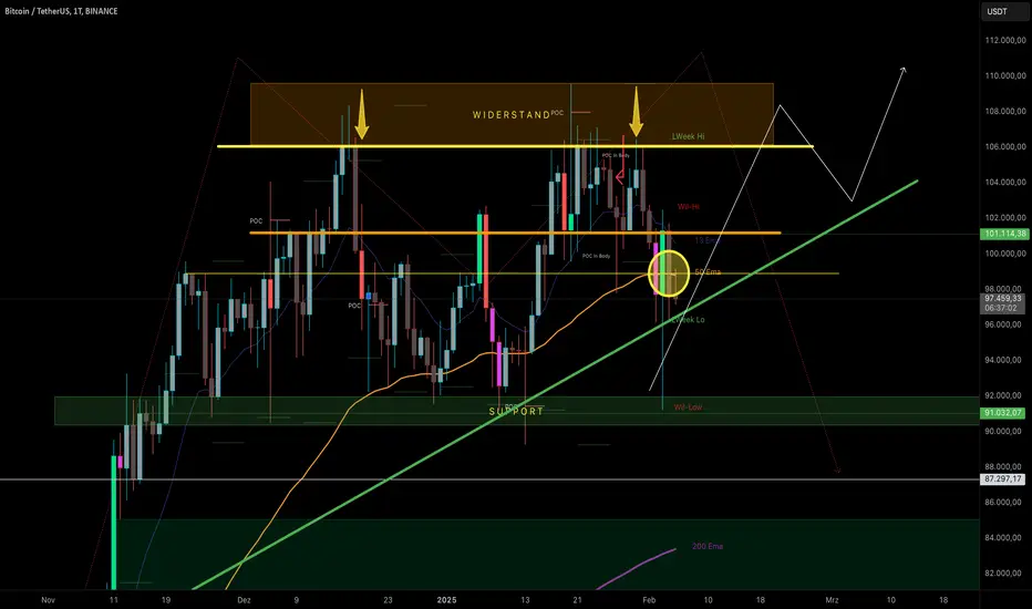 • Erst wenn die grüne Support-Box bricht, könnte sich das große M-Pattern ausspielen, und Bitcoin würde die unteren Vectors abholen.