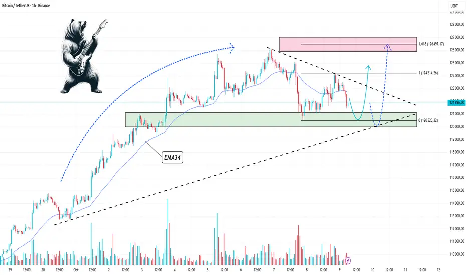 Après une courte correction, le prix se rapproche de l'importante zone de confluence de support autour de 120 500 - là où se trouvait la base d'accumulation précédente. La structure technique montre la possibilité pour le prix de retester cette zone avant de rebondir.
