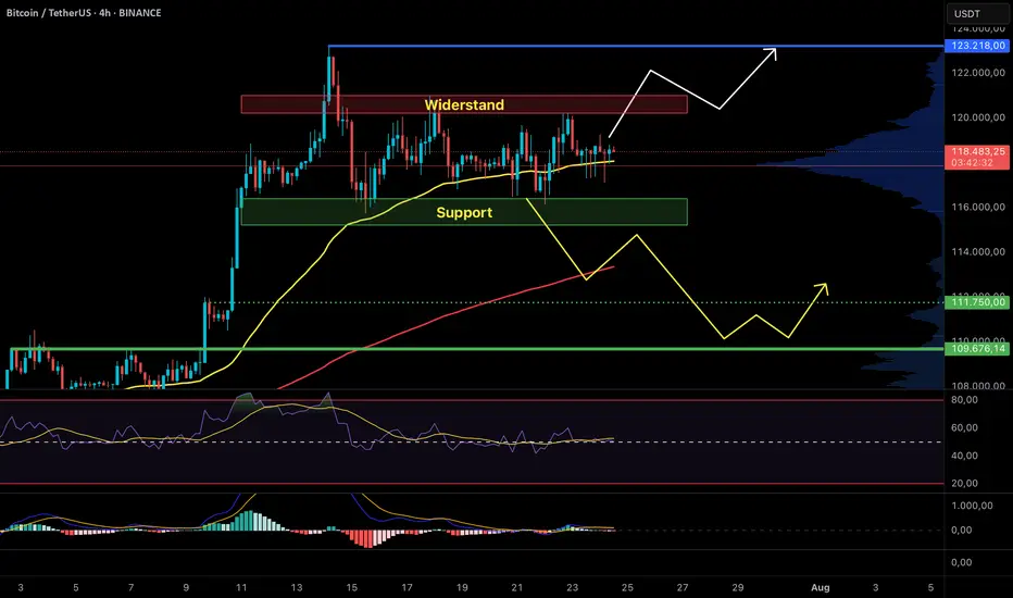 Seit dem Allzeithoch am 14. Juli bewegt sich Bitcoin in einer klar definierten Seitwärtsrange zwischen 116.000 $ und 120.000 $. Trotz mehrfacher Tests hält sich der Kurs weiterhin oberhalb der 50er EMA – doch diese verliert mit jedem erneuten Kontakt an Stärke.