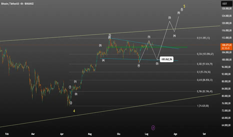 Se guardate il mio grafico, potete vedere la verità: le onde di Elliott sono ben marcate sul grafico. Stiamo completando la microonda 2 dell'onda principale 5. Mi aspetto che la microonda correttiva 2 corregga il prezzo a Fibonacci 0,78, che tocca esattamente la linea discendente inferiore del canale e include il range di prezzo di 100.000. Aspettate il completamento della correzione della microonda 1 e acquistate di nuovo nel range di 100.000. Non aprirò una posizione short e vi consiglio di attendere la correzione del prezzo a 100.000.