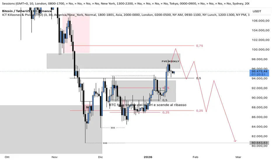 Il prezzo del BTC continua a muoversi molto poco e rimane praticamente nella stessa struttura descritta in precedenza. Il corso è sempre all’interno della FVG WEEKLY e mostra ancora una volta reazioni ribassiste, segno che questa zona resta un’area chiave de forte pressione vendeuse e di manipolazione del mercato.