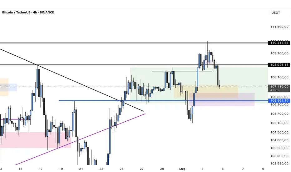 Il prezzo del BTC oggi ha fatto un pullback a livello del range. Il prezzo non riesce ancora a rompere la zona dei 110.000 e ci sono ancora molti venditori a quel livello che riescono a far uscire gli acquirenti. Tuttavia, all'interno del range si sono create zone interessanti di rimbalzo rialzista come la FVG o la candela con lo stoppino che ha sostituito le vecchie FVG. Tenete d’occhio queste zone, è possibile che il prezzo rimbalzi al rialzo in questi livelli.