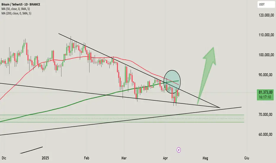 Supporto e resistenza: il grafico mostra anche aree di supporto (linee verdi orizzontali) intorno a 76.000-80.000 USDT. Se il prezzo rompe questa resistenza, potrebbe avere spazio per muoversi verso i livelli successivi indicati.