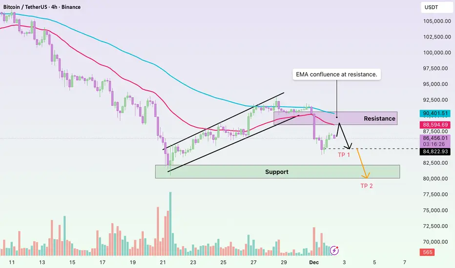 From a technical angle, BTC is trading below both the EMA 34 and EMA 89 — two downward-sloping moving averages indicating the trend remains bearish. The 4H breakdown accompanied by strong volume shows this is a real sell-off. BTC is currently pulling back to retest the resistance levels: 88,700–89,000 at the EMA 34 and 90,400–90,600 at the EMA 89. These zones will reveal whether selling pressure still dominates.