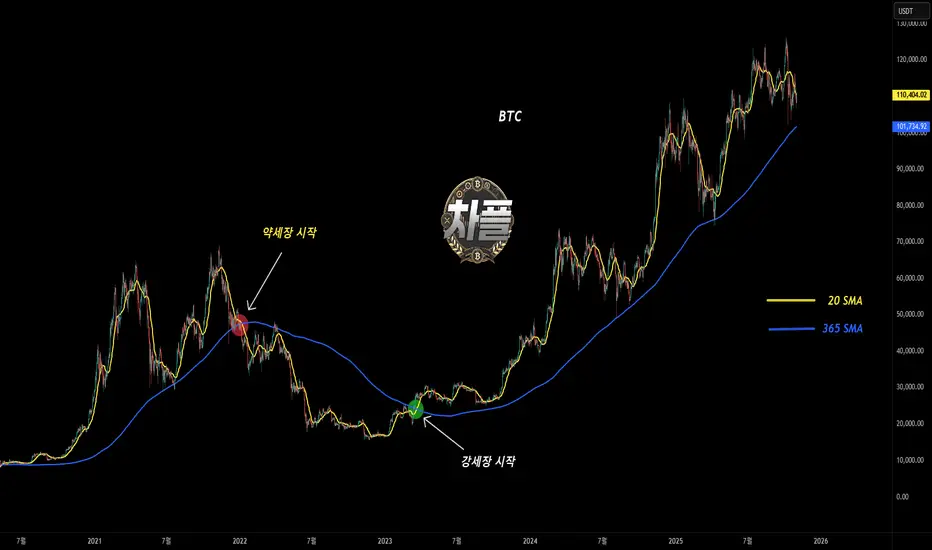 장기적으로 비트코인은 1년 이동평균선(365) 을 중심으로 핵심적인 지지와 저항이 형성됩니다.