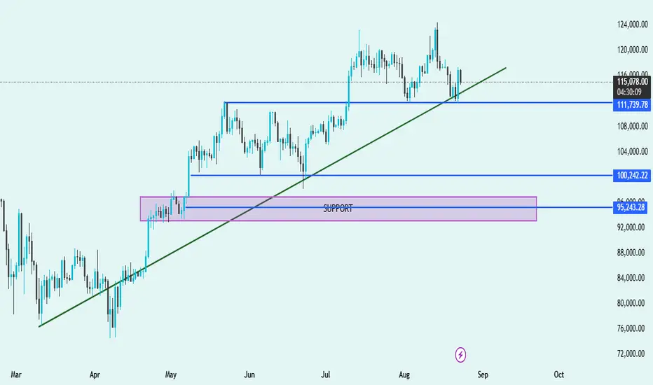 ⚠️ If the price breaks below $111,739 and the trendline, expect a deeper pullback toward $100,242 or even the major demand zone $95,243.