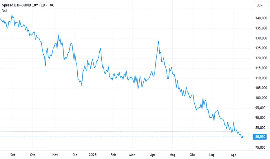 Lo spread BTP-Bund resta stabile a 80 punti base, minimo da aprile 2010. Il rendimento del BTP decennale scende al 3,46% dal 3,48% della vigilia, confermando la fiducia degli investitori.