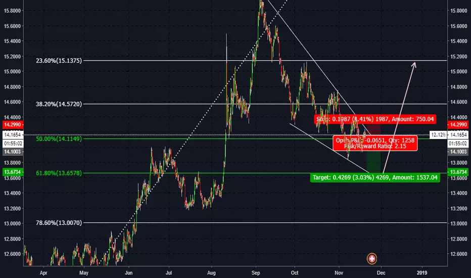 Price is forming a descending wedge. Anticipate pull back to the 61.8% fib level, after which bullish price reversal. This trade is for educational and demonstration purposes only. Trade at your own risk.