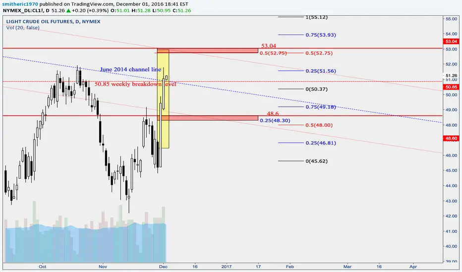 Today i believe that oil broke out of it's lower daily trading range and wills start to work on completing its journey back into it's super trading range - 50.37-55.12 as it closed the day above it's previous weekly breakdown level of 50.85 and above the June 2014 channel line.