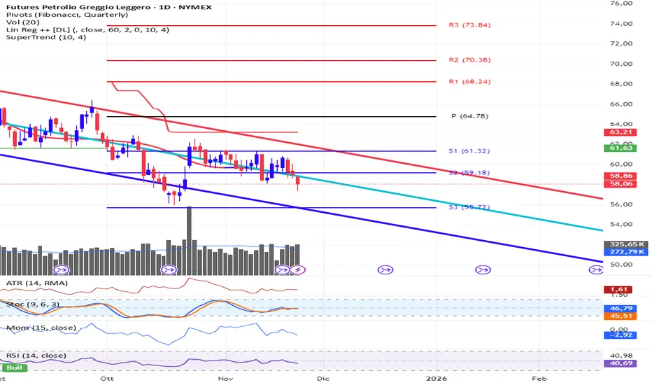 Dal punto di vista operativo, i livelli di supporto e resistenza statici, calcolati con il metodo dei Pivot Point Fibonacci, offrono punti di riferimento cruciali per potenziali ingressi a mercato. Il punto pivot principale (P) per il periodo in esame è situato a 64,78, molto al di sopra dei prezzi correnti e a conferma della debolezza del mercato. In questo contesto, strategie di tipo short potrebbero essere considerate su eventuali rimbalzi verso la parte alta del canale di regressione o in prossimità del primo supporto violato, S1, che potrebbe ora agire come resistenza. Al contrario, per chi cerca opportunità long, un approccio prudente suggerirebbe di attendere segnali di inversione più robusti. Un primo segnale di forza sarebbe un superamento deciso della mediana del canale di regressione e, successivamente, della resistenza dinamica offerta dal Supertrend. Un posizionamento rialzista potrebbe essere valutato in caso di tenuta del supporto S3, con stretti stop loss, o su un più deciso breakout sopra S1, con target iniziale verso il pivot point a 64,78.