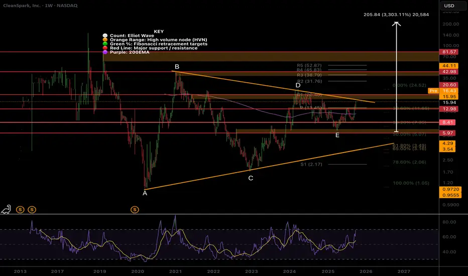Price should consolidate for a while in $16-$20 range as it works through wave D and trend-line resistance. Downside target is the weekly pivot at $13.45 which could offer a great buy!