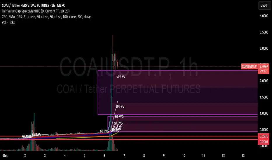 This new asset, COAIUSDT.P, has seen an incredible rise of over 500% in just 24 hours! The 4-hour chart reveals two significant Fair Value Gaps (FVGs) below the current price, presenting potential areas of interest for future price action.