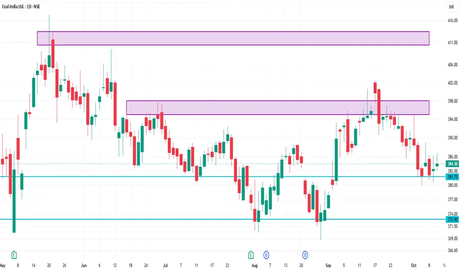 Coal India Ltd is currently trading near its support level of ₹383.35. A breakout above ₹387.85 could signal a bullish trend, while a decline below ₹382.95 may indicate a bearish move. Technical indicators suggest a neutral market condition, with recent candlestick patterns indicating indecision and possible reversal attempts.