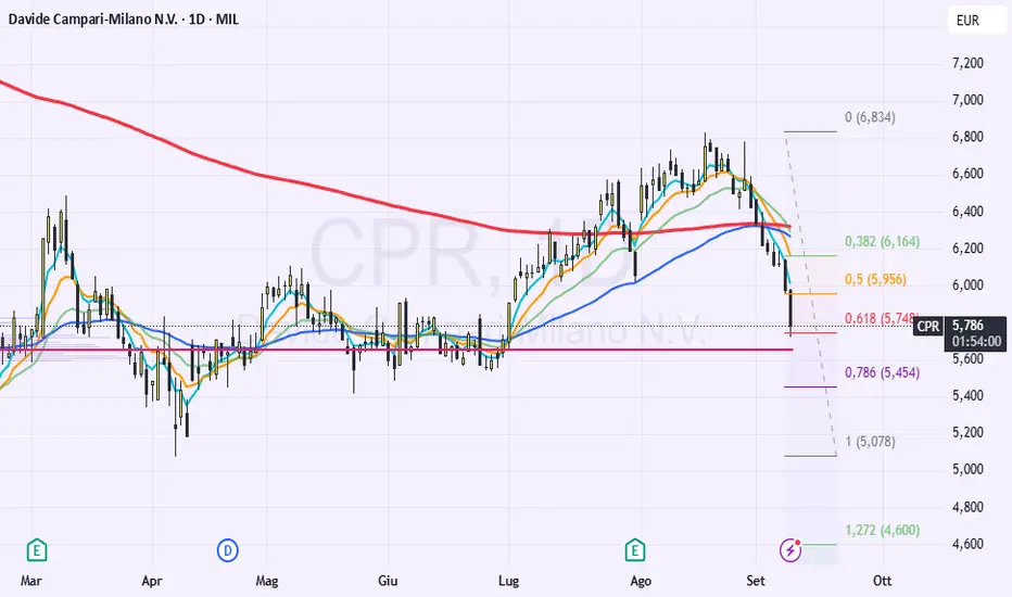 Aggiornamento:il titolo Campari scambia al di sotto del POC volumetrico (5,65 euro) tra il 61,8% e il 78,6% di ritracciamento dai massimi ed ha fermato la propria discesa creando una piccola fase di congestione (che non ha comunque ancora rotto al rialzo l'EMA 10 daily - arancione).
