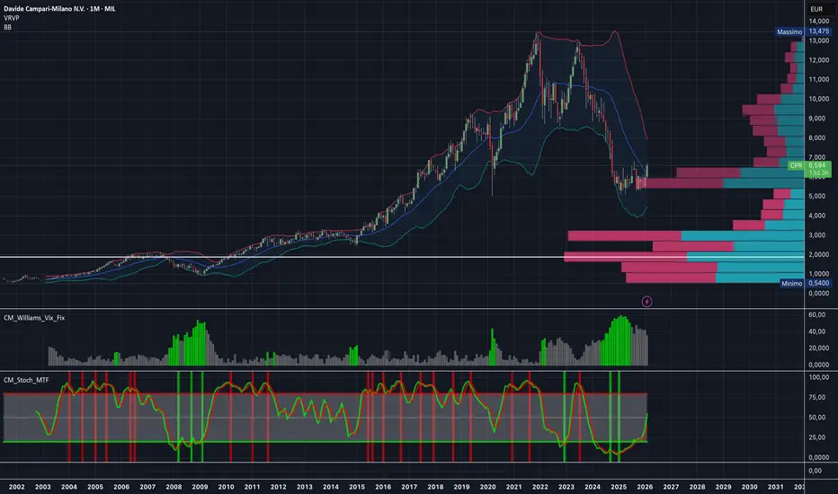 La precedente analisi era basata sul timeframe settimanale, mentre oggi allarghiamo l’orizzonte temporale e analizziamo l’intero set di dati disponibile sul timeframe mensile. Da circa un anno e mezzo il titolo sta lateralizzando su questi livelli e, come evidenziano i volumi orizzontali, pur non trovandoci esattamente sul POC (che resta più in basso e distante), esiste una forte massa volumetrica a sostegno dei prezzi attuali.