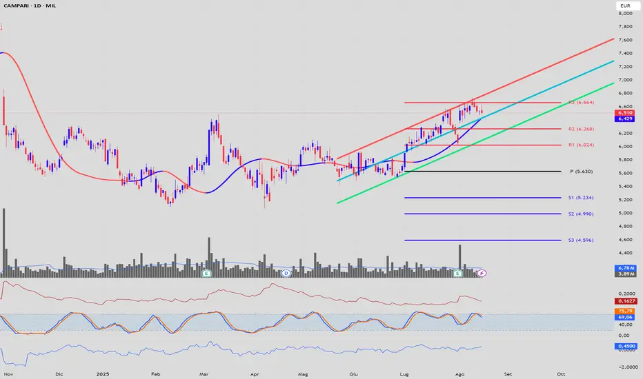 Dal punto di vista operativo, uno scenario rialzista potrebbe prevedere un ingresso long a seguito di una rottura confermata e sostenuta al di sopra della resistenza R3 a 6,644 €, idealmente accompagnata da un aumento dei volumi. Un obiettivo per tale operazione sarebbe la parte superiore del canale di regressione, intorno a 7,282 €. In alternativa, un trader più cauto potrebbe attendere un ritracciamento verso il livello di R2 a 6,268 €, cercando conferme della tenuta di questo supporto per un ingresso a un prezzo più favorevole. Al contrario, uno scenario ribassista potrebbe prendere forma in caso di un chiaro fallimento nel superare la resistenza R3, con la formazione di pattern di inversione. Un segnale di ingresso short sarebbe una rottura decisa al di sotto del supporto R2 a 6,268 €, confermata da un incrocio ribassista dello Stocastico dalla zona di ipercomprato. Il primo obiettivo per un'operazione short sarebbe la resistenza precedente, ora supporto, R1 a 6,024 €, con un target successivo rappresentato dal pivot point centrale (P) a 5,630 €.