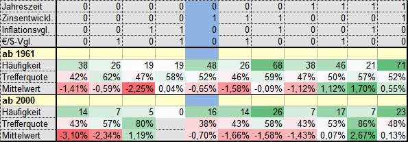 Eine Tabellenstatistik, die ich vor einem Jahr angefertigt habe, gibt die Mittelwerte der log. Monatsperformances über 60 bzw. 21 Jahre im DAX bei Indikatorständen zwischen 0 und 2 an:[img]1.bp.blogspot.com/-32PMhQCpqn8/YNorV7QMIAI/AAAAAAAAAL0/2TPl9AD1OO0YqahIUAtfKN4G2Ii2nCcDwCNcBGAsYHQ/s0/Gebert_Monatsperformance.png[/img]