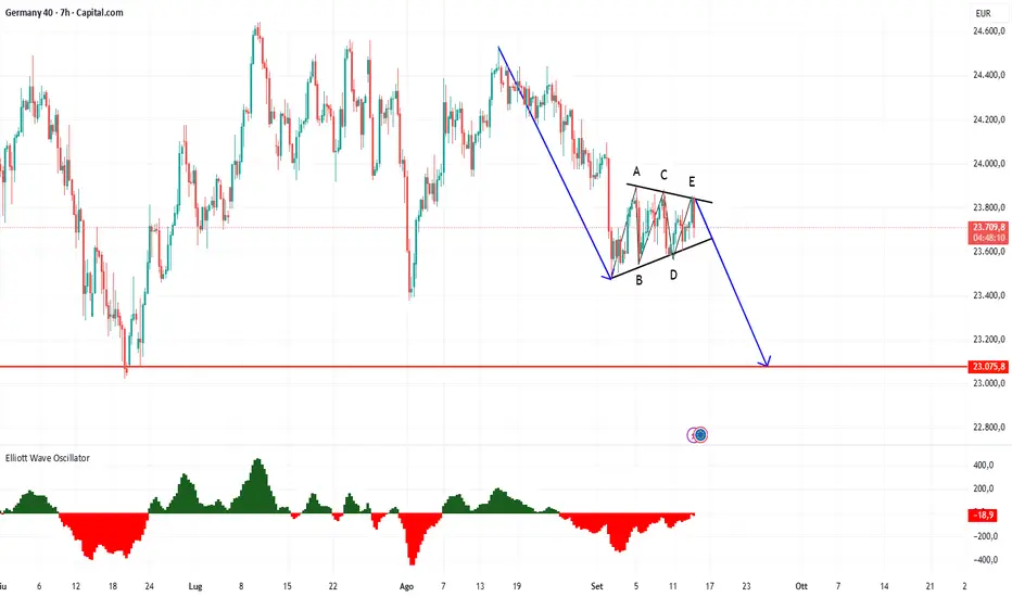 Se invece facciamo riferimento alla Teoria delle Onde di Elliott abbiamo delle condizioni più precise. I triangoli veri e propri, in questa teoria, sono figure di continuazione e al loro interno sono formati da 5 sotto onde classificate con le lettere ABCDE, esattamente come abbiamo fatto nella la figura che si è generata sull’indice tedesco a partire da inizio settembre.