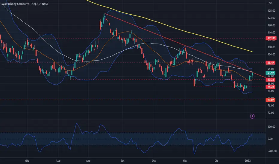 Il titolo Walt Disney ha chiuso la settimana effettuando il test della resistenza dinamica che transita in area 94 $ senza riuscire a superarla, in caso di breakout rialzista i primi obiettivi di prezzo sono l'area dei 99,50 $ e successivamente i 108/109 $.
