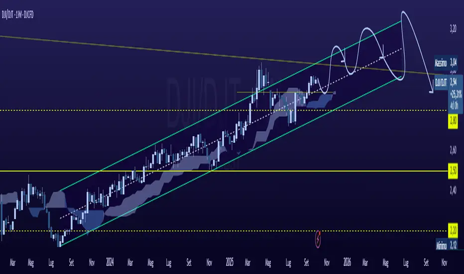 Il pattern proiettato indica un possibile massimo ciclico secondario tra Q1 e Q2 2026 in area 3.20–3.25, seguito da una fase di inversione correttiva.