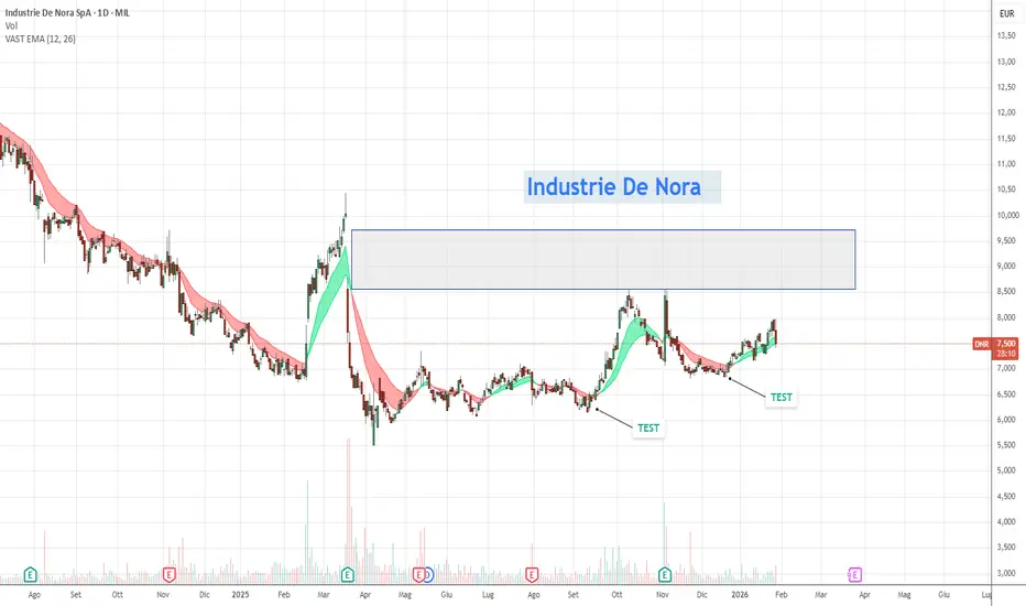 Applicando il metodo Wyckoff, che analizza fasi di accumulazione, markup, distribuzione e markdown, De Nora appare in una fase di accumulazione post-markdown. Dopo il calo dal massimo del 2025, il prezzo si è stabilizzato sopra il minimo di 5.52 euro con volumi ridotti, tipico di "composite operator" che accumulano azioni a prezzi bassi. Non ci sono segni chiari di distribuzione (alti volumi su picchi), ma un test di supporto recente potrebbe precedere un markup se supportato da fondamentali solidi.