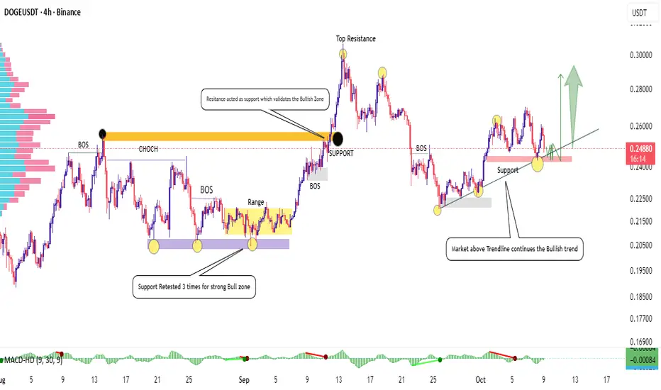 As we analyze the 4H DOGEUSDT chart, the market has shown a clear transition from a bearish structure into a potential bullish phase. After multiple BOS (Break of Structure) points and a CHoCH (Change of Character), the price has started forming higher lows around a key support area that previously acted as a base for bullish moves.