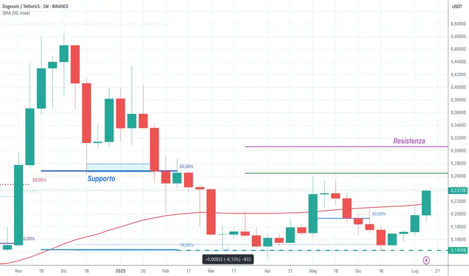 el grafico weekly si può notare come Dogecoin stia registrando un rialzo da quattro settimane consecutive, partendo dal minimo di metà giugno, segnato a 0,1427 USDT. In questo arco temporale, il prezzo ha accumulato un +67% al valore attuale.