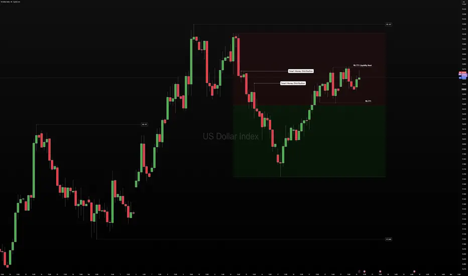 The U.S. Dollar Index is sitting in a premium range, absorbing liquidity near the highs.