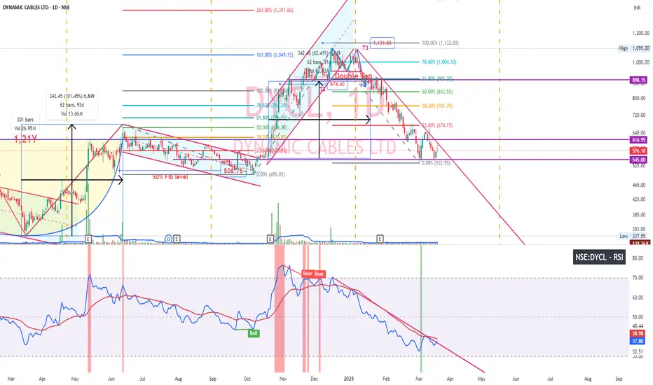 DYCL Dynamic cables daily chart. After exiting parallel channel, DYCL made double top formation and fell 41% breaking down neckline during Jan-Mar '25 correction despite good Q3 result YoY.