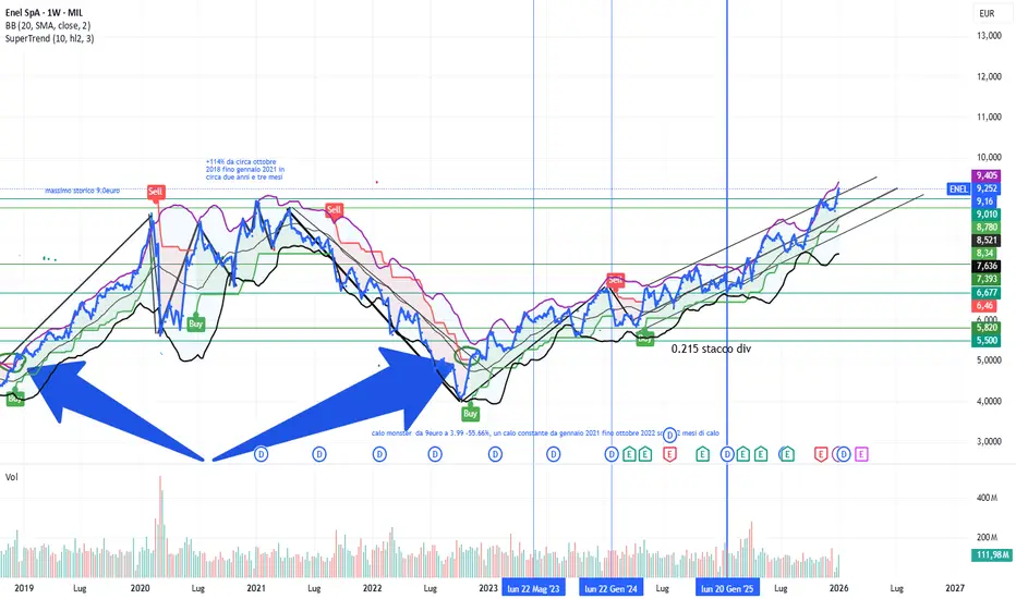 Il piano, infatti, prevedeva 21 miliardi di euro di dismissioni di asset tra il 2023 e il 2025, con l’obiettivo di rafforzare la presenza del gruppo su sei Paesi chiave dove può sfruttare il suo modello integrato: Italia, Spagna, Brasile, Cile, Colombia e Stati Uniti. Il piano ora è stato completato. Sebbene sia difficile ricostruire con precisione l’intero ammontare delle dismissioni, data l’assenza di una cifra consolidata unica che ne confermi la piena esecuzione, ha indicato AlphaValue, l’impatto sulla leva finanziaria della società è stato chiaro: il debito netto è sceso di 11,5 miliardi di euro tra il 2023 e il 2025, di cui 8,4 miliardi nel 2024, permettendo a Enel di ridurre la leva dalle 4,8 volte di fine 2022 a 3,4 a fine 2024 (secondo le metriche S&P contro, rispettivamente, le 3,1x e 2,4x riportate da Enel).Questo rafforzamento del bilancio ha già consentito a Enel di tornare a operazioni di m&a, con l’acquisizione da 1 miliardo di euro di 626 MW di asset idroelettrici da Acciona, chiusa nel primo semestre del 2025, e l’acquisto di oltre 1 GW di asset rinnovabili in Australia nello stesso anno, attraverso una joint venture guidata da Enel per un importo non divulgato.Il mercato, a questo punto, cercava ritorni sul capitale e sono arrivati. Al Capital Markets Day di novembre del 2024, ha ricordato AlphaValue, il gruppo ha annunciato un nuovo dividendo minimo («floor») di 0,46 euro per azione, in aumento dai precedenti 0,43 euro, con un ulteriore potenziale di crescita tramite un payout fino al 70% dell’utile netto ordinario del gruppo.Dal punto di vista della valutazione, nonostante un guadagno del 34,7% nel 2025, il titolo Enel in borsa continua a essere scambiato con uno sconto rispetto al settore: p/e di 12 volte ed ev/ebitda superiore a 7 rispetto alle medie del settore di 14,9 e 9,9 volte. Tanto che AlphaValue ha un target price a 11,2 euro, il 25% in più rispetto alla quotazione attuale in borsa. Ragazzi si cassetta ad oltranza, case green, data center, mobilità elettrica, un possibile ritorno al nucleare di nuova generazione, cosa volete che faccia il titolo con bilanci in crescita....