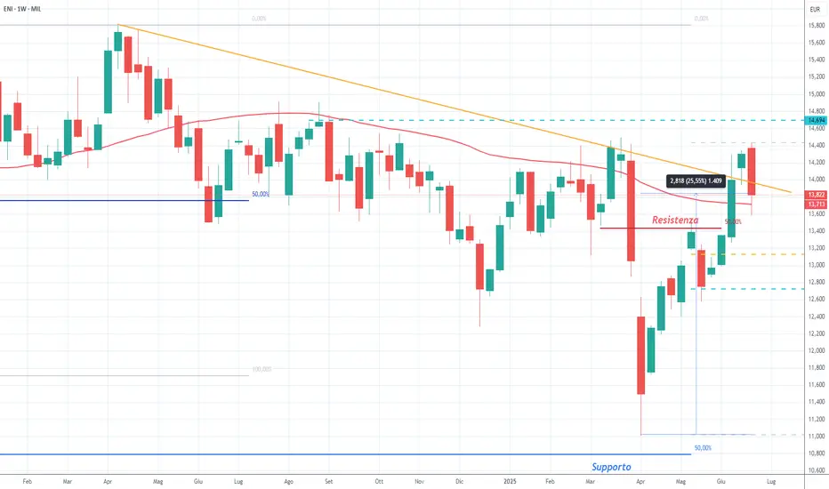Ieri Eni ha toccato un massimo a 14,44€ e ha virato al ribasso. Su base weekly è in calo del 3,15 mentre a giugno comunque il rialzo si attesta a +6,15% mentre su base annua registra un +5,15%.