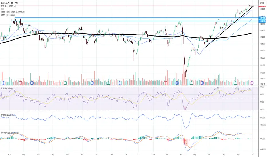 Ancora sotto l'effetto buy back e dividend wash, ma si notano divergenze anche se non evidenti e il titolo sta sopra trend line. In caso di violazione ' possibile una discesa almeno fino alle 2 linee sottostanti con un petrolio cmq ancora con un tono debole ed in area 64$