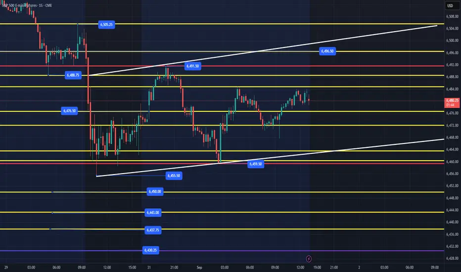 Last night's session our high was 6491.50 and we retested Friday's low around 6459.50. I have put in white a potential bear flag that could continue higher to the 6496.50 level. IF, price does not clear 6505 and hold, we will need to retest the levels below and that could be 6472, 6453 for us to flush and reclaim. Below 6459 and we will need to most likely get out the way and let price flush a few levels, reclaim and back test the 6455-59 zone.