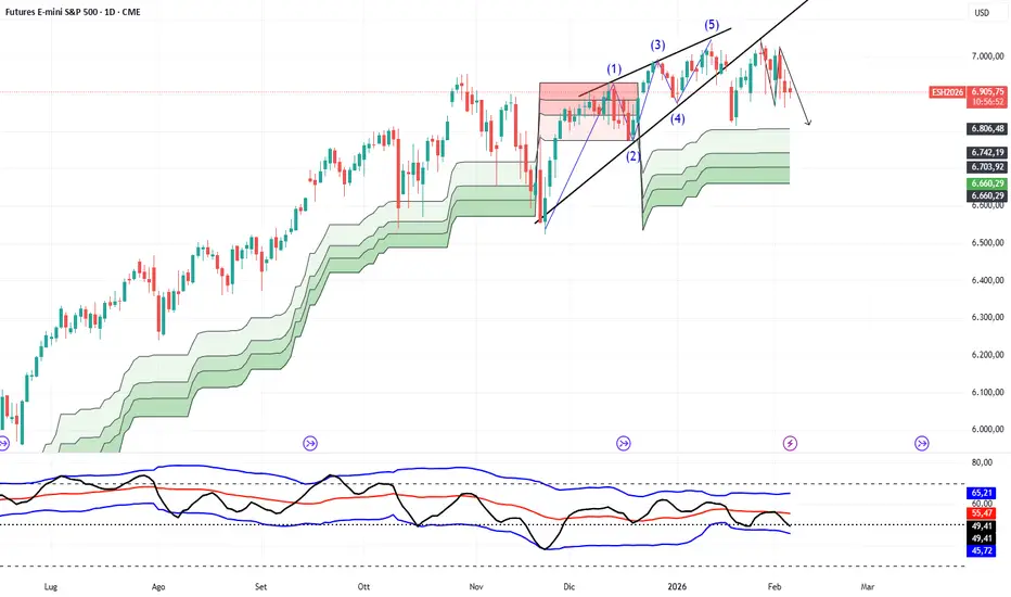 Momentaneamente la struttura su SP500 future rimane buona, il derivato si sta muovendo secondo previsione, quindi una discesa verso i 6800.