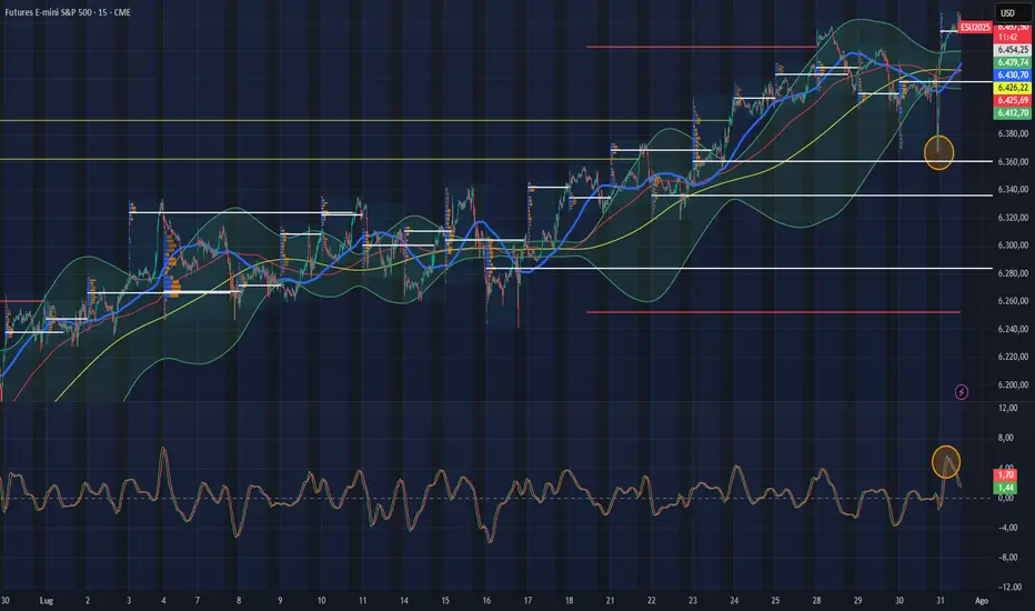 Attenzione al KST che sembra dare segnali meno favorevoli dando forza allo skew ribassista analizzato dai cerchi arancioni. I prezzi sono momentaneamente oltre le bande verdi segnando un ipercomprato; analizzando i vari volume profile da notare diversi POC tutti concentrati tra 6410/6425.