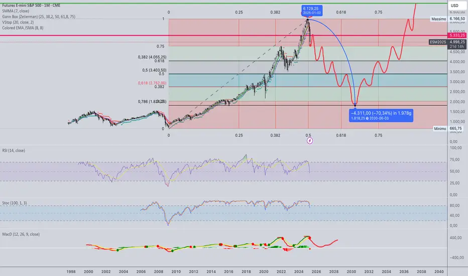 Siamo entrati recentemente in quello che potrebbe essere il GRANDE RESET finanziario partito dal triplo massimo di quest anno. Attualmente il mercato si trova in una posizione di ipercomprato che potrebbe fare partire un mini rally di recupero fino al livello di 5300 punti dove l'S&P500 potrebbe essere di nuovo venduto massicciamente ed iniziare un lento collasso verso i livelli di Fibo indicati nel grafico fino al raggiungimento dell'area di panico = occasione di lunghissimo entro il 2030. Atteso pertanto quello che potrebbe essere il più importante bear market della storia.