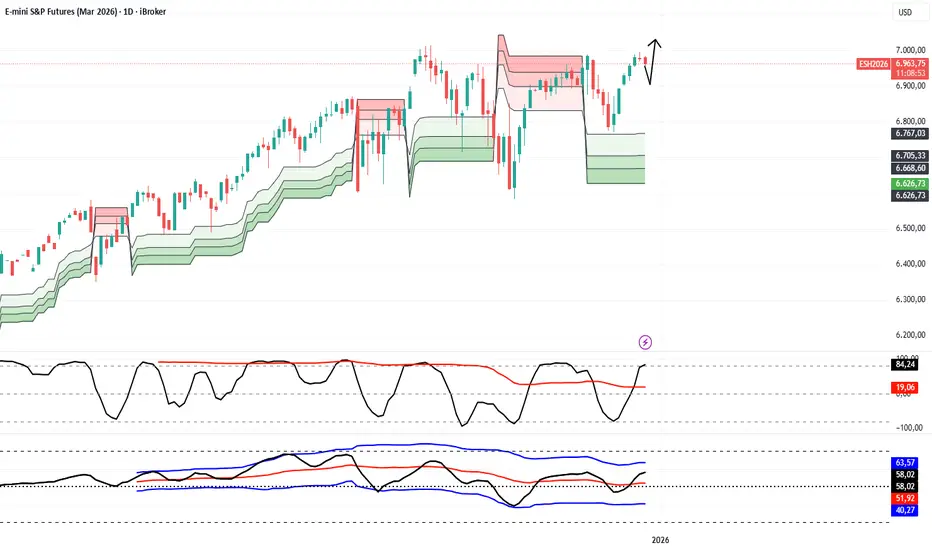 Anche a livello intraday gli indicatori mostrano una tendenza correttiva verso area 6900 dove troviamo supporti statici che potrebbero poi respingere i prezzi nuovamente verso l'alto come evidenziato nel grafico che segue.