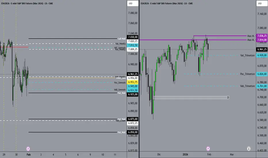 Livello chiave, corrispondente al bordo inferiore del grande HVN cumulativo (area 6875–6970), in confluenza con la VAB della settimana conclusasi il 23 gennaio.