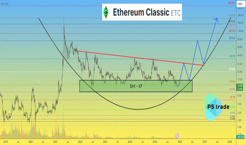 #ETC continues to respect a well-defined multi-year support range at $11–17, which has historically served as a base for upward expansions.