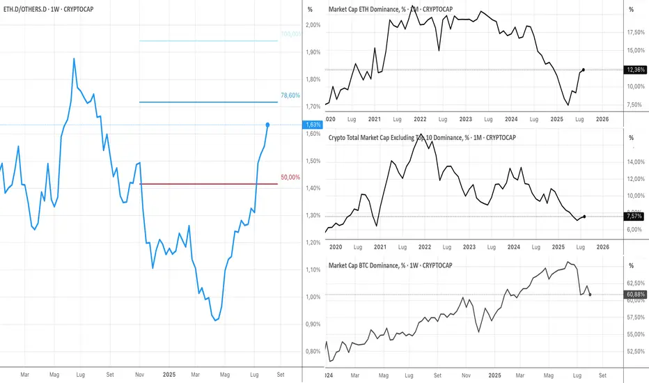 Nel grafico di sinistra (linea blu), il rapporto di forza tra la dominance di Ethereum e quella delle altcoin appare netto: ETH sta letteralmente cannibalizzando il comparto, con un recupero di quasi l’80% dai minimi di aprile e un obiettivo ora puntato verso l’area 1,72.