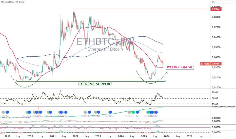 Sul grafico settimanale, la prospettiva di lungo termine rafforza questo scenario. Il rapporto ha formato un ampio pattern a “cup” (o arrotondato), sostenuto da un’area identificata come “Extreme Support” intorno a 0,020 BTC. Dopo diversi anni di declino, Ethereum ha recuperato dinamica relativa positiva rispetto a Bitcoin. Il superamento della media mobile a 50 settimane, seguito da una fase di consolidamento ordinata, potrebbe precedere una nuova estensione rialzista verso la zona 0,045–0,05 BTC, o anche oltre a medio termine. Storicamente, ogni rimbalzo da questa zona di supporto è stato accompagnato da una marcata sovraperformance di ETH rispetto a BTC.
