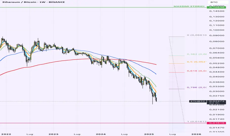 Il rapporto ETH/BTC esprime la forza relativa di Ethereum rispetto a Bitcoin. Attualmente, su grafico weekly, sono evidenti i segnali di debolezza strutturale, con i minimi di settembre 2019 nel mirino.