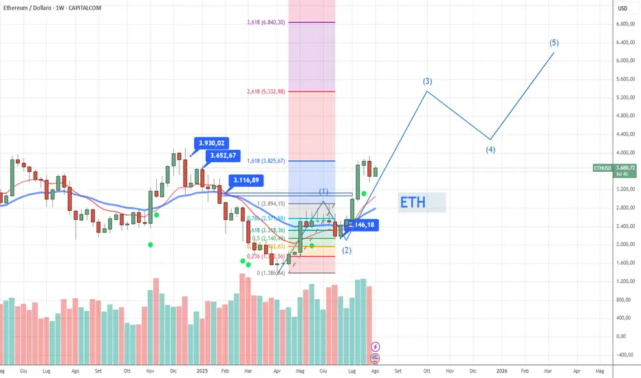 Ho abbozzato un conteggio con onde di elliott valutando la fase attuale come onda 3 in corso. Se il conteggio verrà confermato nei prossimi step, allora potremmo avere un target di lungo periodo tra 5300 e 6000 dollari.